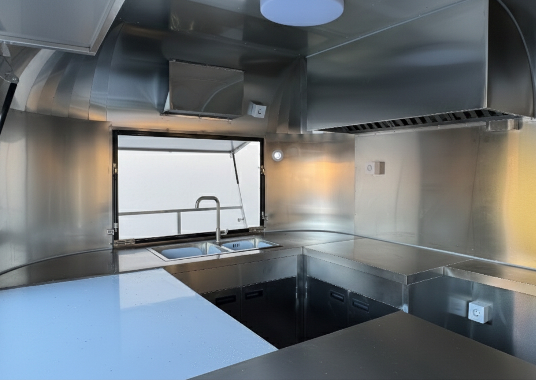 Blaty ze stali nierdzewnej, podwójny zlew, miejsce na maszynę do lodów, szafki i półki robocze, instalacja elektryczna, oświetlenie, duże okno sprzedażowe oraz drzwi boczne.